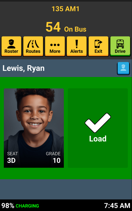 The student photo, if available, helps you confirm this student as an assigned rider on this route, so we'll just tap the green LOAD button on the confirmation screen.